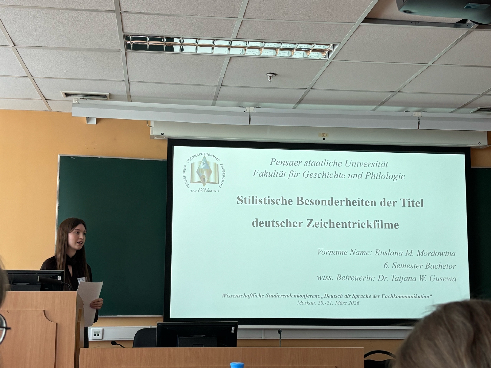 20-21 марта 2026г. на базе МГУ имени М.В. Ломоносова кафедрой иностранных языков и регионоведения была организована научная студенческая конференция на немецком языке, в которой приняли участие студенты 3 курса Толоконникова К., Чуланова А., Мордовина Р. и магистрантка 2 курса Юркова С. Студенты выступали в секциях «Лингвистика» и «Перевод и переводоведение» с научными докладами.