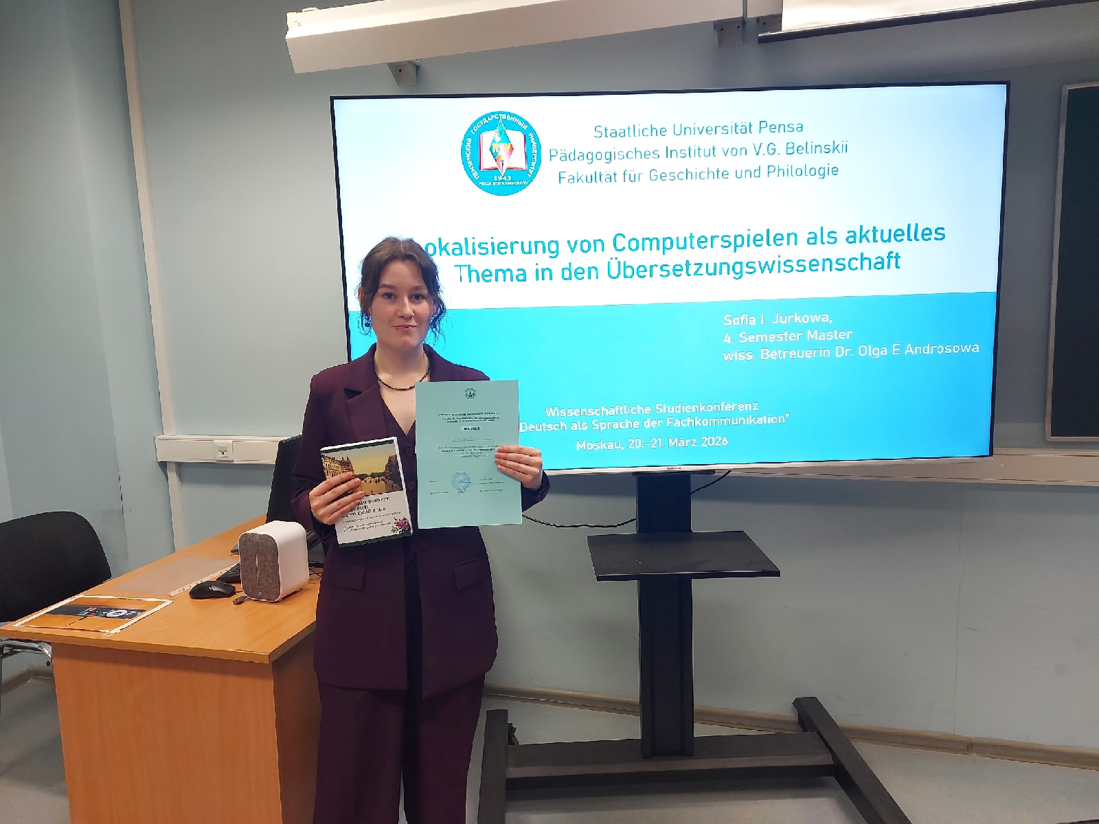 В секции «Перевод и переводоведение», где поднимались проблемы разных видов перевода и переводческой деятельности, доклад Юрковой С. на тему «Lokalisierung von Computerspielen als aktuelles Thema der Übersetzungswissenschaft» был признан одним из лучших докладов. В своем докладе Юркова С. представила процесс локализации как комплексную задачу и рассмотрела возможные стратегии и тактики, необходимые для решения переводческих проблем.