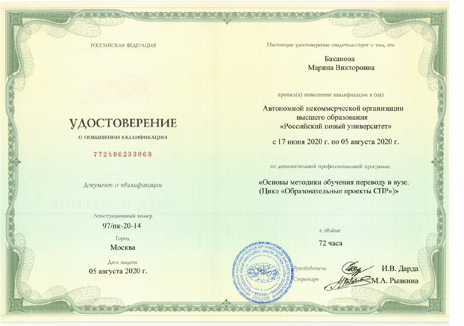 Преподаватели кафедры постоянно участвуют в конференциях и конкурсах, повышают свою квалификацию. За последние 5 лет 100% состава кафедры прошли курсы повышения квалификации и переподготовки. Среди таких курсов: Цифровые технологии в преподавания профильных дисциплин (АНО ВО «Университет Иннополис»), «Основы методики обучения переводу в вузе», «IT в переводе», «Психолого-педагогическое и методическое сопровождение преподавателя английского языка», Программа повышения квалификации “Online-workshops: European teaching practices and pedagogy” (Dresden), «Реализация учебного процесса в рамках информационно-образовательной среды (ЭИОС) вуза», «Особенности обучения граждан с ограниченными возможностями здоровья»